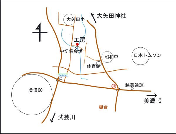 東海北陸道美濃IC出入り口交差点より西に約3kmサークルK信号を北へ右折体育館の裏を西に約300m中切集会場前にあります。 お越しの際には電話で一報いただければ幸いです。