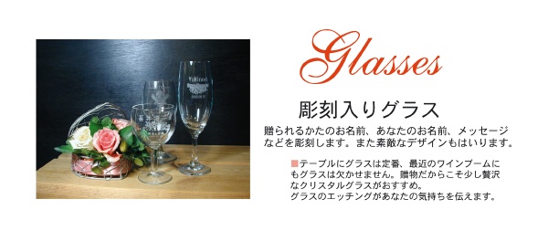 ワイングラスで乾杯。 販売価格(彫刻・税込み) 1個\1,800 デザイン・ご注文 *10個以上のご注文で1個\1,200 デザイン・ご注文 |