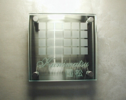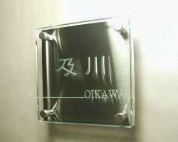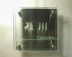ステンレスをベースにガラスをスペーサーで浮かせて表札にしました。