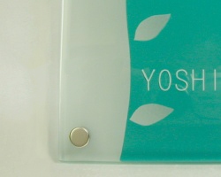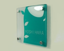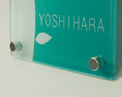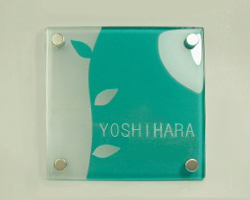 すりガラスの柔らかさとベースのカラーの鮮やかさがすてきな表札です。