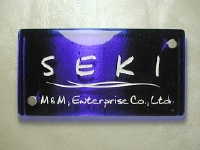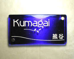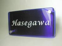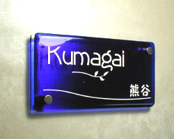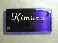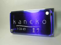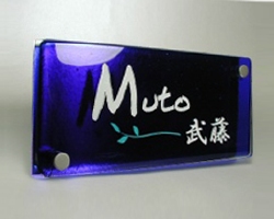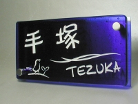 濃いブルーの色ガラスを通してステンレスに反射する光が表札の表情をかえます。サンプル以外でもお好みのデザインで素敵な表札をお作りします。気軽にお問合せください。