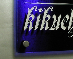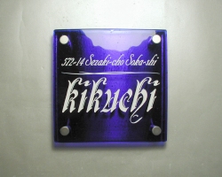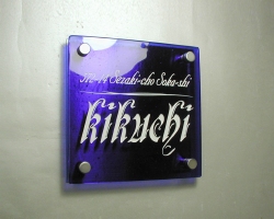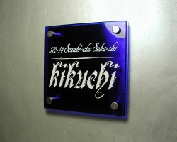 濃いブルーの色ガラスを通してステンレスに反射する光が表札の表情をかえます。サンプル以外でもお好みのデザインで素敵な表札をお作りします。気軽にお問合せください。