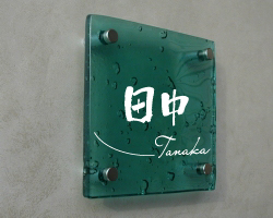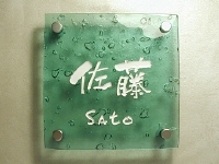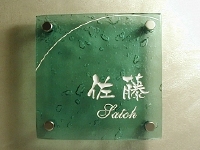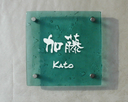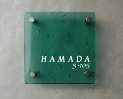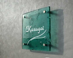 複層のガラスを重ねて焼き上げた厚口のガラスを表札にしました。