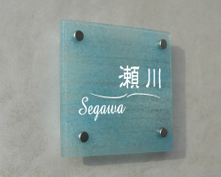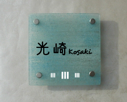 複層のガラスを重ねて焼き上げた厚口のガラスを表札にしました。