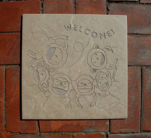 玄関先でヘーベル君やラム君がお出迎え。アプローチタイルの1枚に彫刻してはいかがですか。