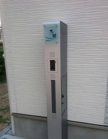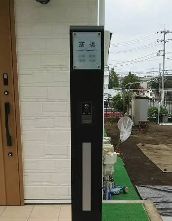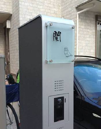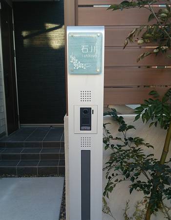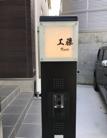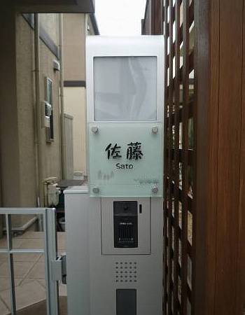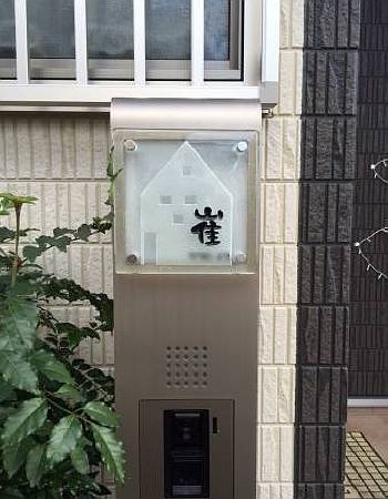 門柱の照明は生かし、照明の下に表札を取り付けました。 透明抜きしたイラストがさりげなくて素敵です。