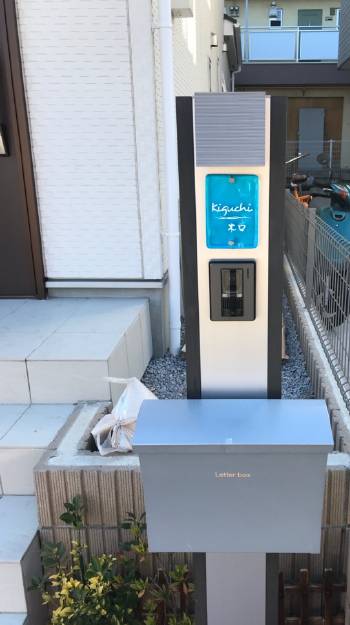 白いカラーガラスの表札がシルバーの門柱にとても似合います。 |