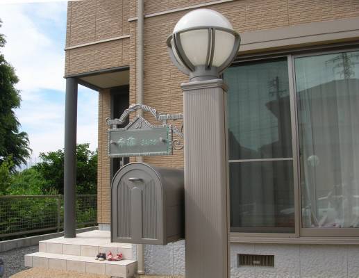 照明付きポスト。鋳物の表札取付部分に既製品ではシールタイプの切文字が入りますが、ガラスに換えて個性的に。
