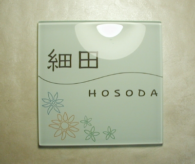 カラーガラスの中でも人気の高い白いガラス表札です。 施主さまからいただいた花のイメージをデザインしました。花の色は青、オレンジ、緑とカラフルに配色しましたが、あまり派手にならないように線画でまとめました。
