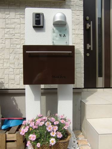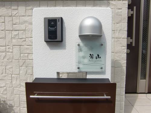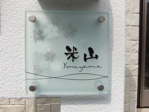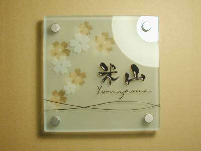 モダンなデザインの機能門柱にシンプルなすりガラスの表札が素敵です。桜の花びらを配置したデザインはガラスの特徴を生かして透明抜きとすりガラスで表現しました。 ガラスを通して出来る影が見る角度によって変化し表札の表情をより豊かにしました。スタイル430表札施工例になります。