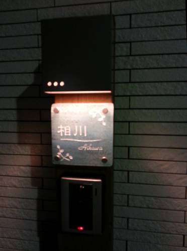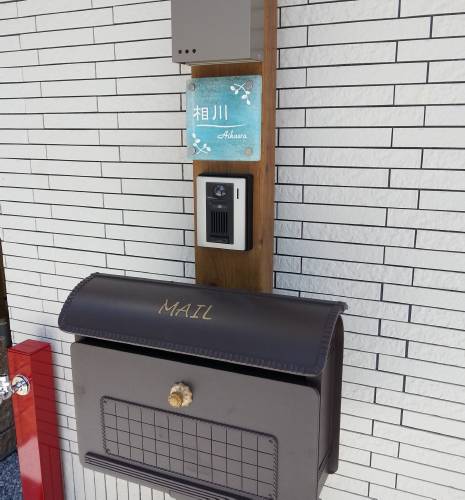 | オリジナルの木製の柱を機能門柱に見立てダウンライト、インターホン、メールボックス、表札を取り付けました。 茶色の自然木にうすい空色のガラス表札がとても似合います。溶かしガラスは完全な不透明ではなく、微妙に透けて見える木の色合いと調和して表札に深みを増します。 夜間のライトアップも縞ガラスのデザインが生きた個性的な雰囲気を醸しだします。 |