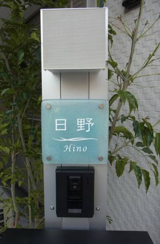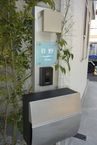 | シルバーグレーの機能門柱にうすい空色のガラス表札がとても似合います。 溶かしガラスは副層の透明ガラスの間に色のついたガラスの粉末を箒で掃いたように縞状にデザインをしております。ガラスの中に色粉が点在するため単色にない深い味わいと手づくり感のある表札に仕上がります。 中央のラインと文字のシンプルなデザインの表札で、とてもおしゃれで素敵な門柱になりました。 |
