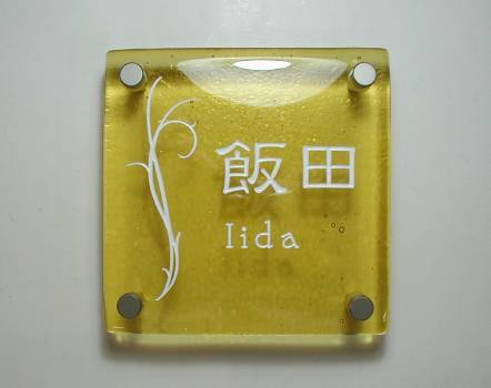 | 厚口色ガラス(淡アンバー):140×140×15.0 文字、イラスト:表から彫刻、白 |