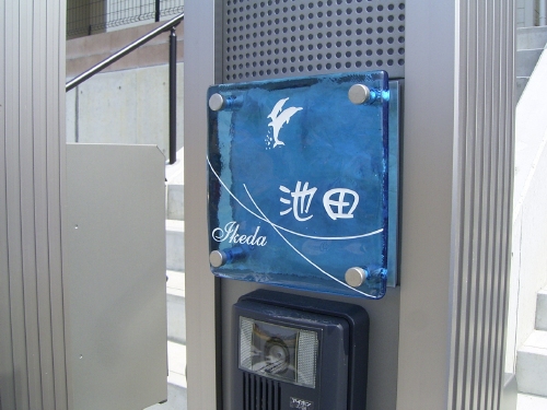 金属の機能門柱に輸入色ガラスの表札を取り付けました。 |