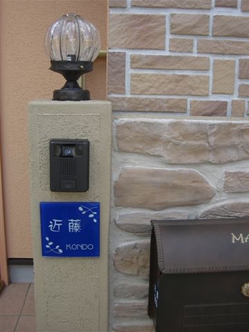 プロバンス風の明るいイメージのお家に紺色のカラーガラスの表札が素敵なアクセントになります。 ベージュが基調色なら茶系の表札でイメージを統一、とも考えますが、紺色の表札が落ち着いた雰囲気で存在感をアピールします。