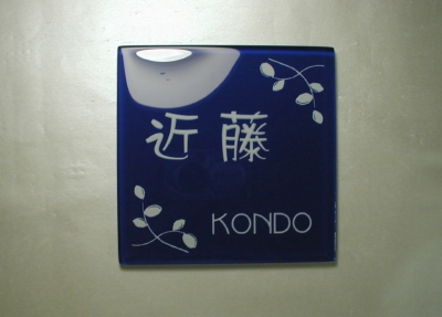 カラーガラス(紺):150×150×8.0 文字:裏から彫刻、白色入れ イラスト:裏から彫刻、白色入れ