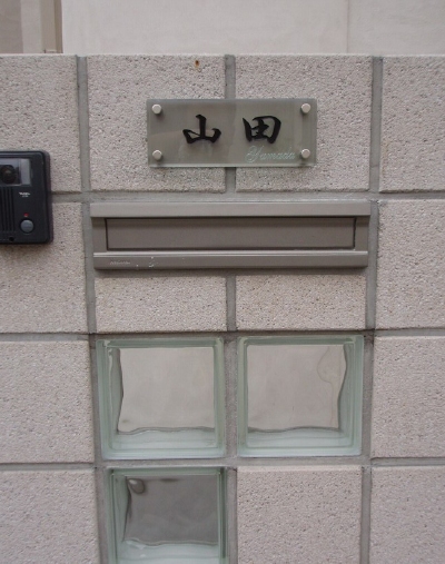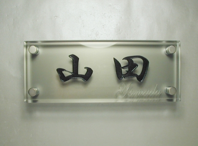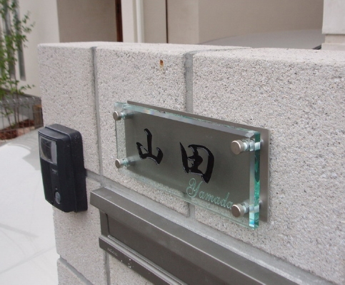 | 表札のサイズからガラスの面取りの仕上げ、ベースのシャイングレーまでご主人の提案で表札が完成しました。漢字の色もはじめから黒を指定されました。お家のイメージとご主人の表札のイメージがピッタリ一致してとても良い感じになりました。 | |