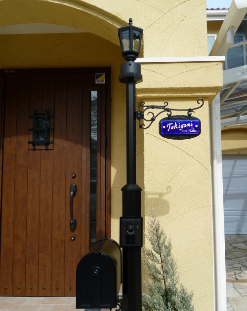 街角の街灯を思わせる機能ポール黒色のアイアンベースに濃いブルーのガラスがアンティークなイメージに一役買っています。