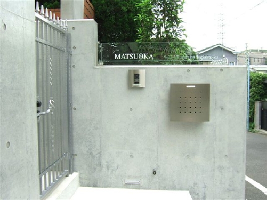 | 打ち放しのコンクリートと相性の良いガラスをパーテーション風に組み込み表札にしました。 苗字は遠くからでもはっきり見えるように白文字に、 ラインとご住所は彫刻部分をクリアコートで仕上げました。 ガラスに深く掘り込むことで文字が鮮やかに浮かび上がって、ガラス彫刻ならではの魅力的がたっぷり。 ガラスの使い方ひとつでアプローチの印象もかなり変ってきます。都会的でとてもクールな印象です。 |