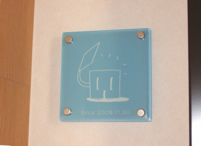 ヘーベル君のロゴを新居建築の記念に玄関の内壁に取付けられました。スカイブルーのガラスサインが気分をさわやかにします。 笑顔のヘーベル君がご家族がお出かの時、ご帰宅の時にこれからもずっと見守ってくれる事と思います。