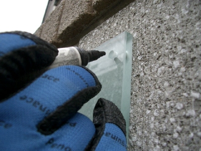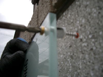 C表札本体をセットしてドライバーでねじ込む 注)本体取付けの彩はガラス破損の恐れがございますので電動ドライバーの使用はお避けください。手動のドライバーをご使用ください。 |