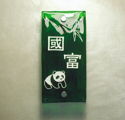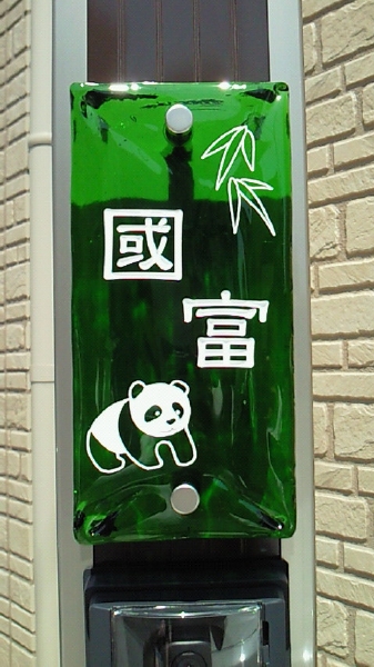 かわいいパンダのイラストと笹のデザインをご希望されました。 機能門柱の既製の表札から取替えられました。門柱の背景は焦げ茶のためグリーンの表札を直接取り付けると色が沈んでしまうため、ガラスのグリーンが鮮やかになるようにガラスの後ろに白のアクリル板を置きました。また、既設の表札の穴に併せて取付けが出来るように加工しました。