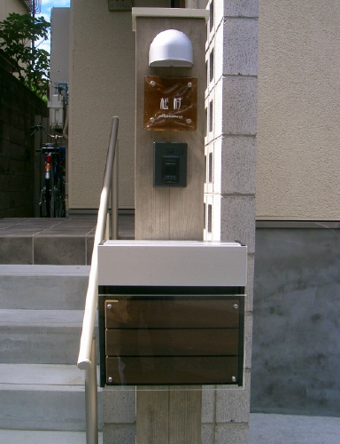 機能的な人工物の中に波うつガラスは、手作りならではの存在感と柔らかなイメージを演出します。木目調のベージュにブラウンの表札が落ち着いた雰囲気を感じさせます。 きっと、訪れる方もその存在感に目を止めていかれることでしょう。