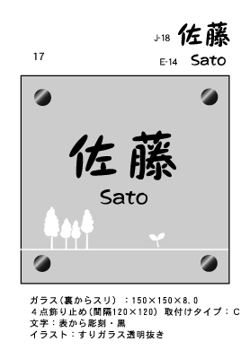 ご希望で林のイラストと若葉のイラストをデザインに入れさせて頂きました。デザインを透明抜きすることでガラスの透明な質感も引き立ってとてもおしゃれな表札になりました。透明を通して見えるステンレスも見る角度によって光の反射でキラキラしたり暗く見えたりと表札の表情も変化してガラス表札の特徴といえます。