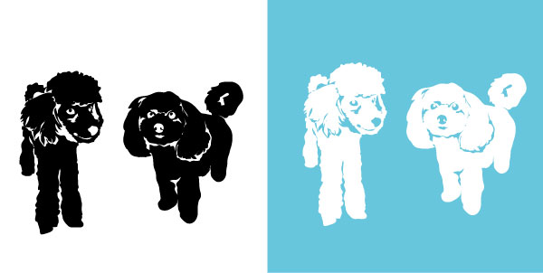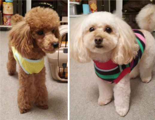 お写真は2匹とも服を着せておりましたが服なしのイラストを作成しました。イラストが白色なので背景を青色にしたイメージを作成しました。